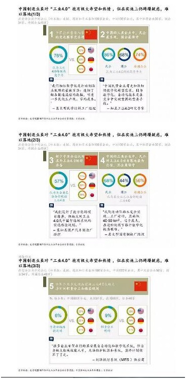雖然中國制造商對工業(yè)4.0抱有很大的熱情和期望,但對實施具體策略有較多疑慮。只有57%的中國企業(yè)對工業(yè)4.0做好了充分的準(zhǔn)備,遠(yuǎn)低于美國(71%)和德國(68%)。