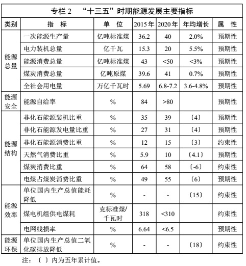 專欄 2 “ 十三五” 時期能源發(fā)展主要指標(biāo)