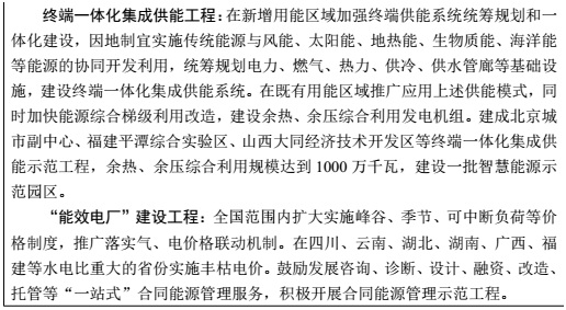 工程, 實(shí)施城市配電網(wǎng)建設(shè)改造行動, 強(qiáng)化統(tǒng)一規(guī)劃, 健全技術(shù)標(biāo)準(zhǔn), 適度超前建設(shè), 促進(jìn)城鄉(xiāng)網(wǎng)源協(xié)調(diào)發(fā)展。 統(tǒng)籌電網(wǎng)升級改造與電能替代, 滿足居民采暖領(lǐng)域電能替代。 積極推進(jìn)棚戶區(qū)改造配套熱電聯(lián)產(chǎn)機(jī)組建設(shè)。 加快天然氣支線管網(wǎng)建設(shè), 擴(kuò)大管網(wǎng)覆蓋范圍。 在天然氣管網(wǎng)未覆蓋地區(qū)推進(jìn)液化天然氣、 壓縮天然氣、 液化石油氣直供, 保障民生用氣。推動水電氣熱計(jì)量器具智能化升級改造, 加強(qiáng)能源資源精細(xì)化管理。 積極推進(jìn)城市地下綜合管廊建設(shè), 鼓勵能源管網(wǎng)與通信、 供水等管線統(tǒng)一規(guī)劃、 設(shè)計(jì)和施工, 促進(jìn)城市空間集約化利用。