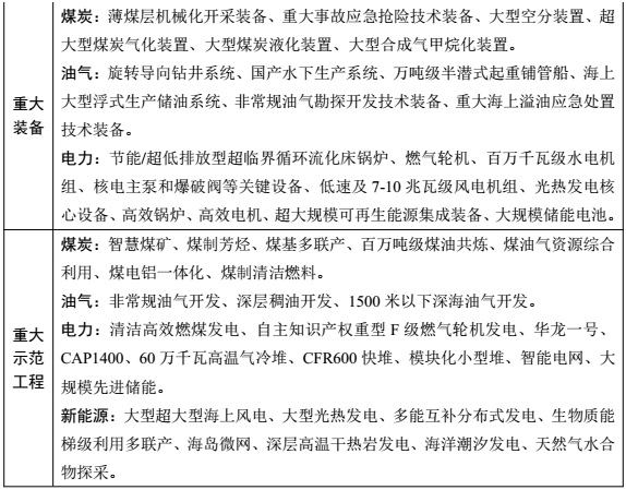 加強(qiáng)重點(diǎn)領(lǐng)域能源裝備自主創(chuàng)新, 重點(diǎn)突破能源裝備制造關(guān)鍵技術(shù)、 材料和零部件等瓶頸, 加快形成重大裝備自主成套能力, 推動可再生能源上游制造業(yè)加快智能制造升級, 提升全產(chǎn)業(yè)鏈發(fā)展質(zhì)量和效益。實(shí)施科技創(chuàng)新示范工程。 發(fā)揮我國能源市場空間大、 工程實(shí)踐機(jī)會多的優(yōu)勢, 加大資金、 政策扶持力度, 重點(diǎn)在油氣勘探開發(fā)、 煤炭加工轉(zhuǎn)化、 高效清潔發(fā)電、 新能源開發(fā)利用、 智能電網(wǎng)、 先進(jìn)核電、 大規(guī)模儲能、 柔性直流輸電、 制氫等領(lǐng)域, 建設(shè)一批創(chuàng)新示范工程, 推動先進(jìn)產(chǎn)能建設(shè), 提高能源科技自主創(chuàng)新能力和裝備制造國產(chǎn)化水平。
