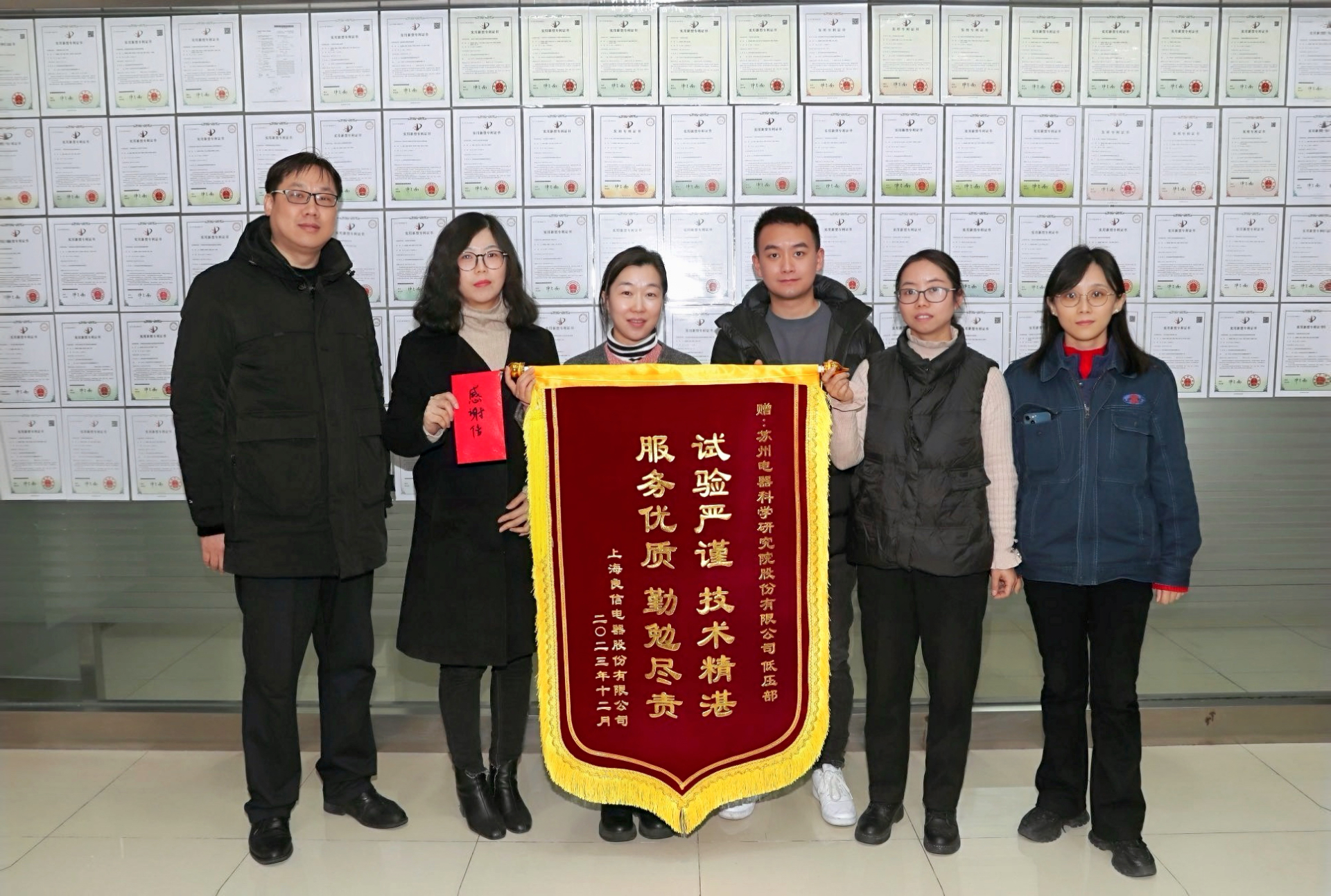 2024年1月19日,上海良信電器股份有限公司(以下簡稱“上海良信”)檢測中心部長王銳率隊走進蘇州電科院,為公司送來“試驗嚴謹 技術精湛 服務優質 勤勉盡責”的錦旗和感謝信,并致以新年祝福。蘇州電科院總經理吉熙玥、副總經理陳鳳林等公司領導熱情接待了來訪一行,并陪同考察和座談交流。