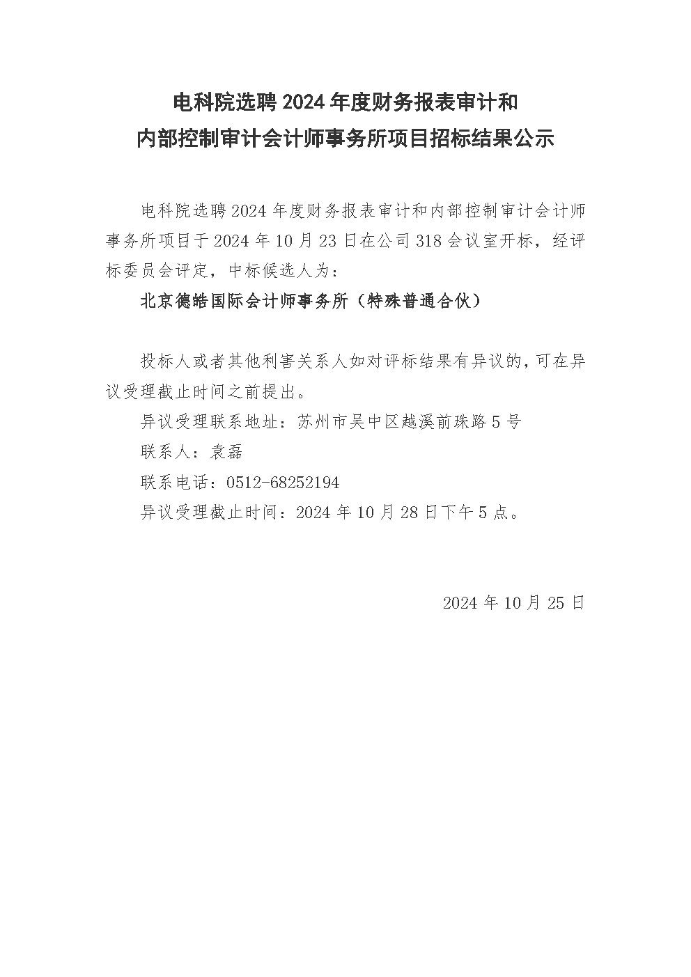 電科院選聘2024年度財務報表審計和內部控制審計會計師事務所項目招標結果公示